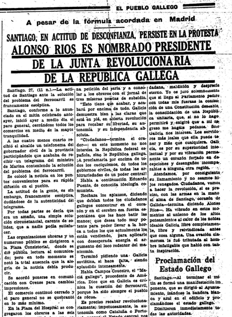 "Al terminar el mitin se formó una manifestación imponente, que se dirigió al Ayuntamiento, izándose la bandera blanca y azul en el edificio y proclamándose el estado gallego. Dimitieron inmediatamente todas las autoridades. El pueblo pidió clamorosamente que Alonso Ríos ocupase la presidencia de la Junta Revolucionaria y, entonces, dijo éste que era del pueblo y que antes de ceder pasarían sobre su cadáver". ('El Pueblo Gallego', 28 de xuño)