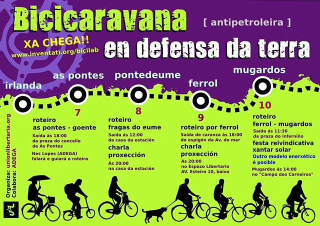 "Xa chega!!", avisan desde a Unión Libertaria (UL). É a 'Bicicaravana [antipetroleira] en defensa da terra' que esta cuarta feira vai iniciar un percorrido pola comarca de Ferrol para denunciar as moitas ameazas ambientais.