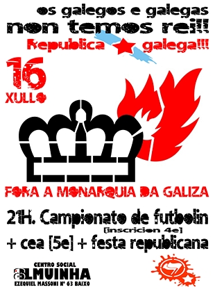 A monarquía, acrecentan, "é debedora do réxime anterior" xa que o rei Juan Carlos I "ten xurado os principios do chamado 'movimiento nacional' do ditador español Franco". Por iso, convidan os veciños de Marín a amosar o seu apoio á República Galega, pendurando bandeiras galegas nas suas casas e participando nos actos festivos programados.