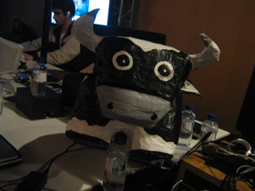 Logo de preguntas transcendentes e con obxectivos ben merecentes, pasamos a cuestións máis viscerais e perentorias pasando de certas horas da madrugada. Antes de marcharmos do recinto tecnotrónico, brindamos a pé de computador cun agasallo de chocolate.