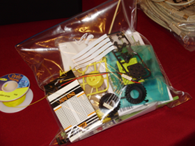 Na bolsa que ven na imaxe hai un conxunto de tarecos, enredos, parafusos, cabos, chips, e revoltallos electrónicos variados de nome indescifrábel para os non iniciados. Pero seica iniciarse nestas ciencias non é tan complicado. Para demostralo, XGN08 organiza un obradoiro de robótica. Entre outros, cada participante recibe este kit.