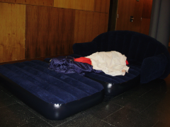 Algúns ciber-romeiros improvisan máis ca outros para pasar a noite. Nesta primeira houbo un golpe de xente que atreveu a desafiar o sono. Con todo, os máis sibaritas do soño non se conforman cun envurullo urxente en calquera recanto. Velaí algún dos camastros mellor arranxados que vimos esta noite. Parafraseando un menos coñecido filme que deu en famoso filme de culto entre a tecno-fauna: con que soñan os androides do país?