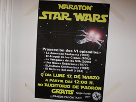 Aí teñen a proposta para a semana entrante que argallaron os mozos da Asociación Xuvenil Padronesa. "Maratón StarWars". Proxección integra dos seis episodios desde a mediodía do luns 17. A cita: no Auditorio de Padrón. Leven algo para botarlle o dente entre filme e filme.