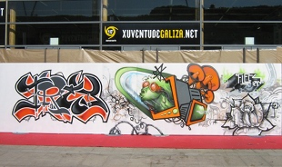 Como xa é tradición no XGN, a entrada do recinto -desta volta o Multiusos Fontes do Sar- acaba decorada por artistas grafiteiros con moito xeito.